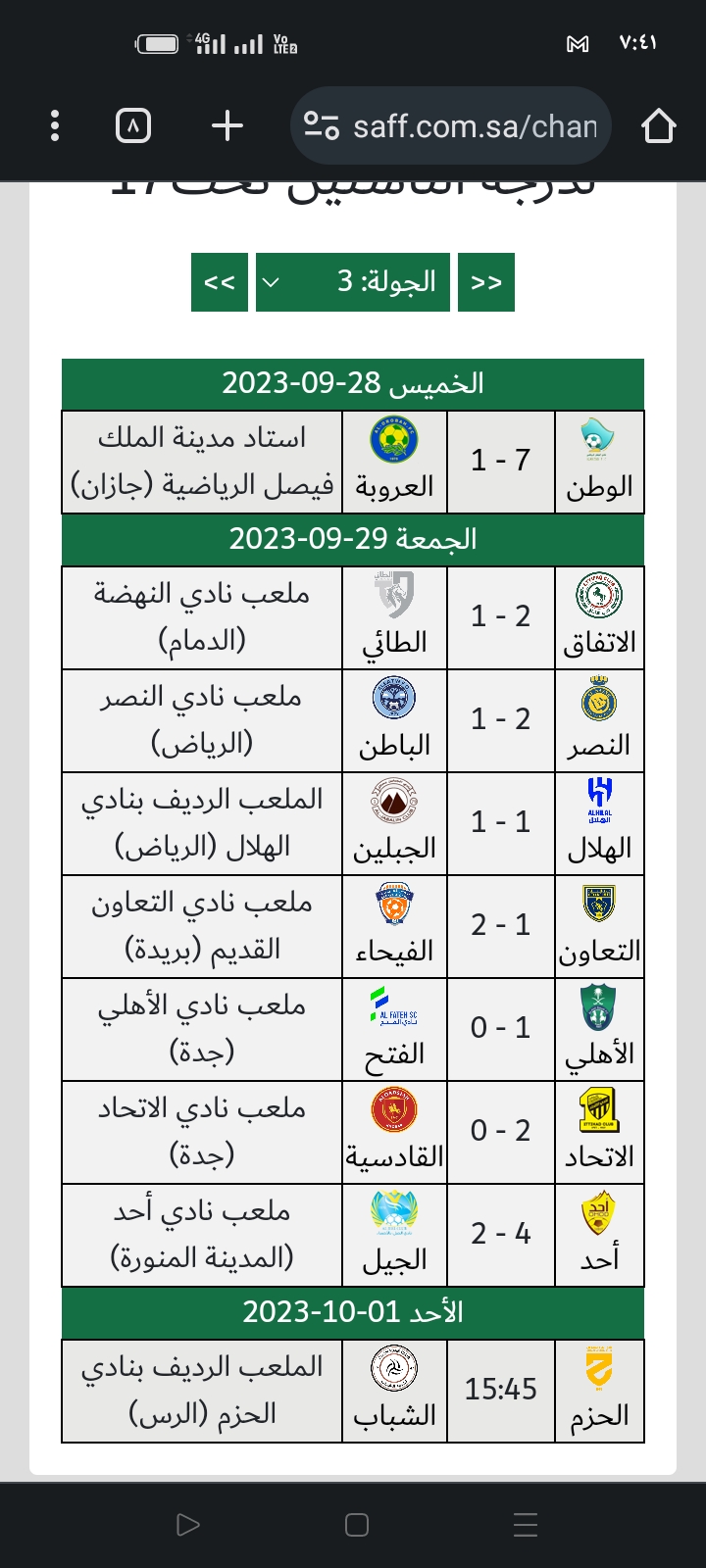 استكمل اليوم الجمعة مباريات الجولة الثالثة من الدوري الممتاز فئة الناشئين 17 سنة حيث أقيمت أمس الخميس على ملعب مدينة الملك فيصل الرياضية بجازان مباراة جمعت بين نادي الوطن من ضمد بمنطقة جازان ونادي العروبة انتهت لصالح الوطن بنتيجة ثقيله بعد أن كان متأخرا لتنتهي المباراة بفوز الوطن 7/1 كابر نتيجة حتى الآن بقيادة المدرب الوطني القدير علي الريثي وقد تبقت مباراة واحدة ضمن الجولة تقام بعد غدا تجمع الحزم مع الشباب