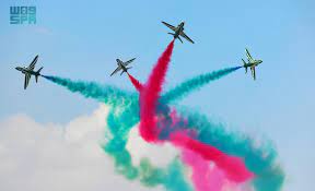 وشارك فريق الصقور السعودية مع فريق الاستعراض الجوي المصري “النجوم الفضية”، بالعرض الجوي الذي اشتمل على مجموعة من التشكيلات والمناورات بالطائرات العسكرية استخدم من خلاله ألوان علمي البلدين حيث تميزت بالمهارة والدقة ونالت إعجاب الحضور.