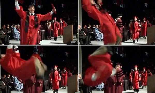 تعرّض طالب أمريكي لموقف محرج في حفل تخرجه من الجامعة، حين قام بقفزة خلفية في الهواء على منصة التتويج؛ فوجد نفسه ممدداً على وجهه على الأرض.