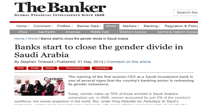بدأت بنوك المملكة في سد الفجوة بين الرجل والنساء في السعودية، وذلك بعد تولي امرأة منصب الرئيس التنفيذي لأحد أكبر البنوك.. هذا ما رأته مجلة “ذا بنكر” المملوكة لصحيفة “فاينانشال تايمز” البريطانية.