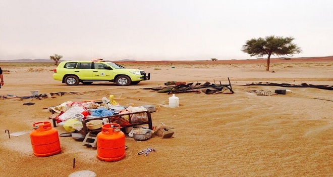 ورد بلاغ للدفاع المدني بمحافظة سميراء من مواطن يقطن بالصحراء في ضواحي محافظة سميراء يفيد بفقد أبنائه نتيجة عاصفة رملية مزقت خيمته، وتسببت في ضياع قطيع أغنامه.