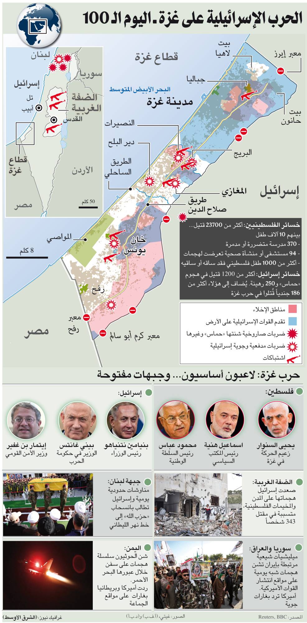 مع حلول اليوم (الأحد)، تكون الحرب الإسرائيلية على قطاع غزة أكملت 100 يوم لم تتوقف فيها آلة القتل عن حصد أرواح الغزيين الذين فقدوا حتى الآن أكثر من 23 ألف قتيل، مع آلاف آخرين ربما قضوا تحت الأنقاض بدون التمكن من انتشال جثثهم. ويُضاف إلى هؤلاء عدد غير معروف من المقاتلين في فصائل فلسطينية قضوا في أنفاق دمرها الإسرائيليون.