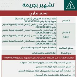 شهرت وزارة التجارة بكلاً من: “خالد عيظه حمد المنهالي” سعودي الجنسية يحمل الهوية الوطنية المنتهية بالرقم (XXXXXX7398) و”عسكر علي حسن ناجي” يمني الجنسية يحمل هوية مقيم المنتهية بالرقم (XXXXXX6479) و”عماد علي غالب حسن” يمني الجنسية يحمل هوية مقيم المنتهية بالرقم (XXXXXX6554) و”بسام علي غالب حسن” يمني الجنسية يحمل هوية مقيم المنتهية بالرقم (XXXXXX6547) و”فيصل عسكر علي حسن” يمني الجنسية يحمل هوية مقيم المنتهية بالرقم (XXXXXX4597) .