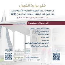 أعلنت جامعة نايف العربية للعلوم الأمنية فتح باب القبول في برامج الدراسات العليا لمراحل الدكتوراه والماجستير والدبلوم العالي للعام الدراسي 2024م (1445هـ) بدءًا من تاريخ 17 مارس 2024م حتى 14 إبريل 2024م لبرنامج الدكتوراه، بينما يستمر التقديم متاحًا لبقية البرامج حتى تاريخ 11 يوليو 2024م في عدد من التخصصات الأمنية والعدلية.