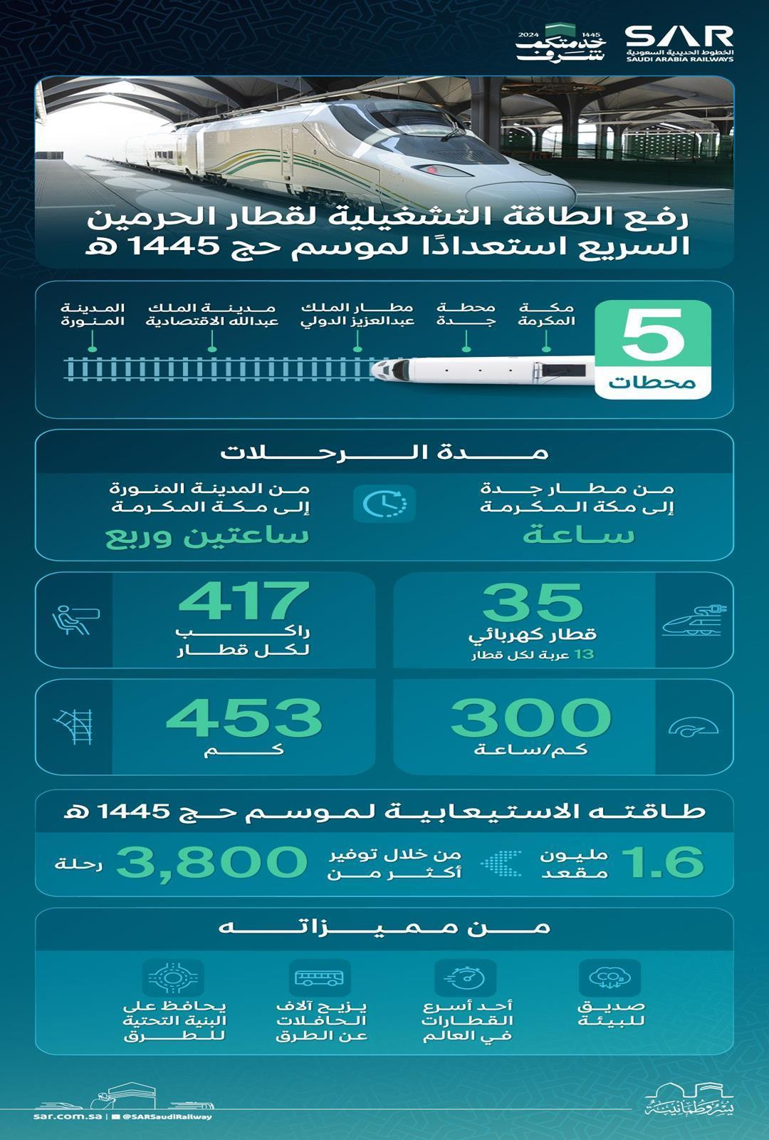 يذكر أن قطار الحرمين السريع يعد أحد أسرع عشر قطارات ركاب في العالم بسرعة تبلغ 300 كيلومتر في الساعة، ويعمل بأسطول مؤلف من 35 قطارًا، وبطاقة استيعابية تبلغ 417 مقعدًا للقطار الواحد، والذي يعد صديقًا للبيئة بصفر إنبعاثات كربونية، إضافة إلى دوره الرئيس بالحفاظ على البنية التحتية للطرق بإزاحة آلاف الحافلات عنها.