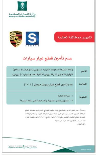 وبيّن القرار أن المخالفة تمثلت في عدم تأمين قطع غيار بورش موديل ٢٠١٢، حيث صدرت عقوبة تتمثل في غرامةٍ ماليةٍ، والتشهير بنشر العقوبة في صحيفةٍ على نفقة الشركة.