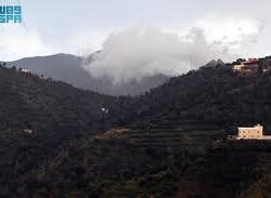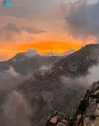 وتغمر السحب قمم الجبل الأسود بلمساتها الساحرة ، في مشهد يأسر القلوب ويبعث في النفس الهدوء، وسط مناظر خيالية تتكرر يوميًا مع المطر والضباب الكثيف الذي يعانق قمم الجبال ويتمايل مع أشجارها، ناقلاً معه شذا النباتات العطرية وأزهار الأشجار السامقة.