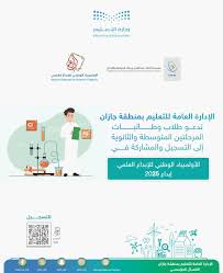 دعت الإدارة العامة للتعليم بمنطقة جازان طلاب وطالبات المرحلتين المتوسطة والثانوية إلى التسجيل والمشاركة في الأولمبياد الوطني للإبداع العلمي “إبداع 2025م” .