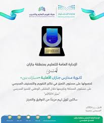 أعلنت هيئة تقويم التعليم والتدريب القائمة الأولى لمدارس التميز، حيث جاءت ثانوية مدارس جازان الأهلية بالإدارة العامة للتعليم بمنطقة جازان ضمن المدارس الحائزة على التميز في نتائج التقويم والتصنيف المدرسي على مستوى المملكة وتم تكريمها خلال الملتقى الوطني للتميز المدرسي تميز 2024م، الذي نظمته وزارة التعليم بالتنسيق مع هيئة تقويم التعليم والتدريب في الرياض اليوم.