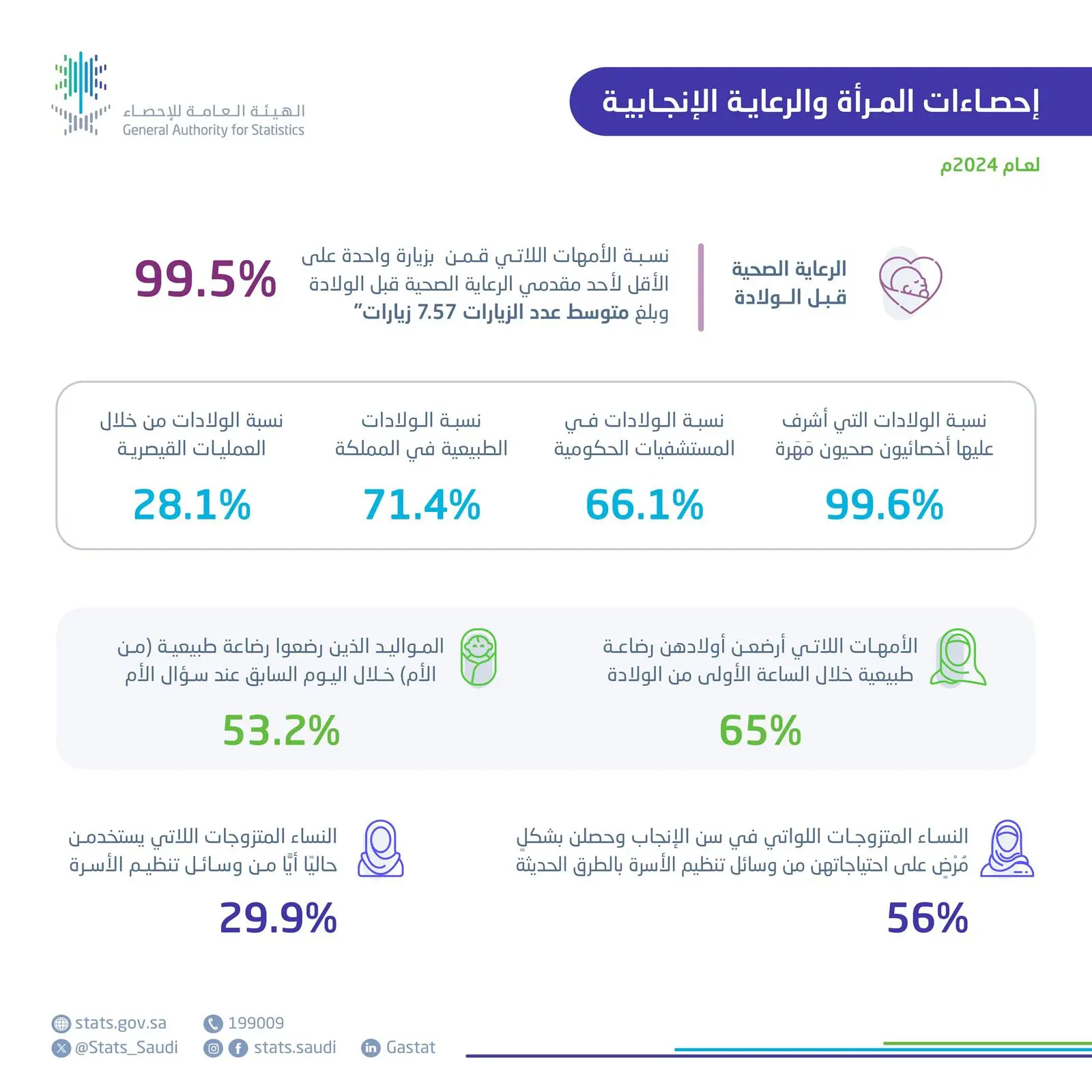 أوضحت الهيئة العامة للإحصاء، أن نسبة الولادات الطبيعية في المملكة بلغت 71.4 %، مقابل 27.1 % ولادة قيصرية في الفئة العمرية (15- 49 سنة)، فيما بلغت نسبة حضور الاختصاصيين الصحيين المهرة أثناء الولادة 99.6 %.