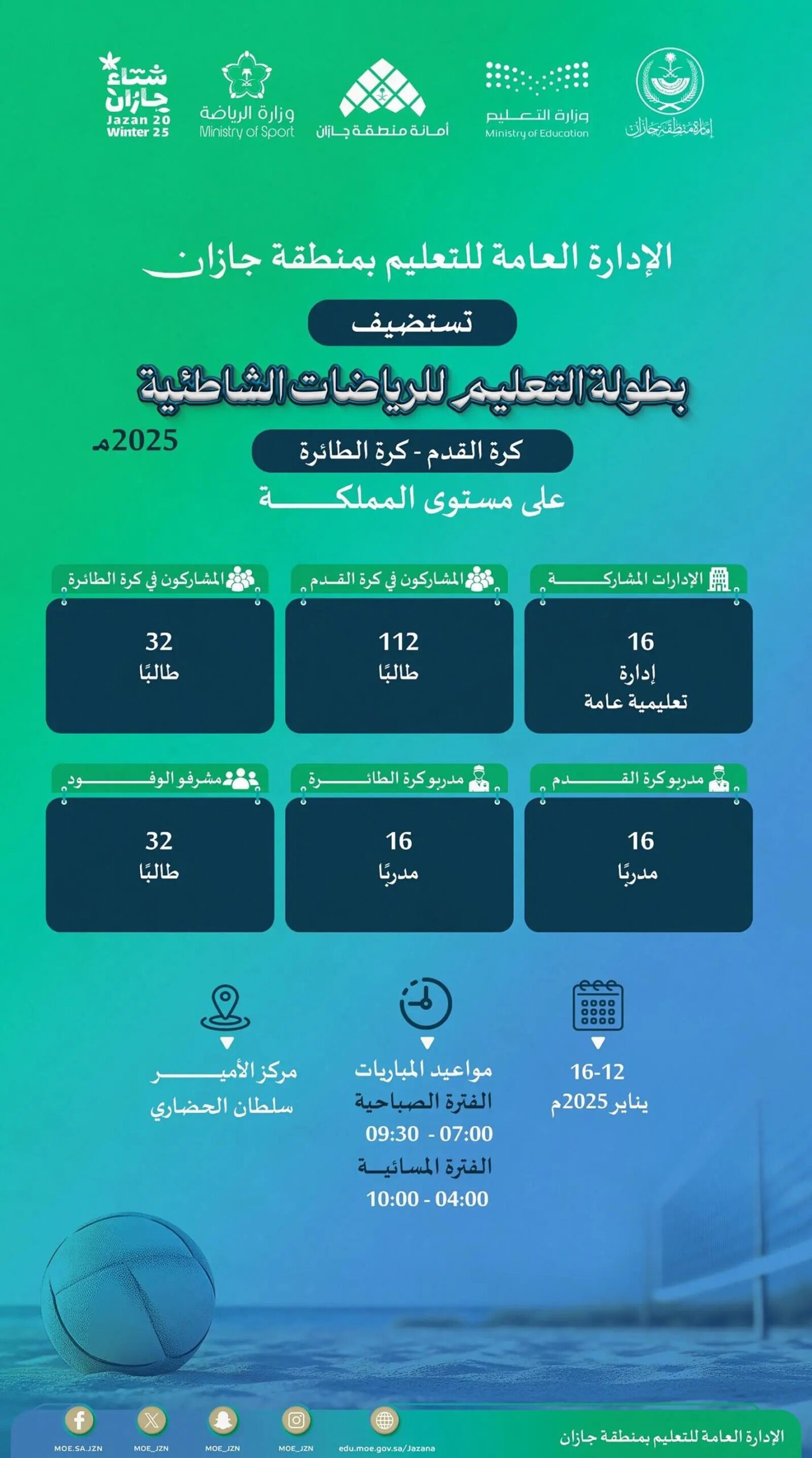 تستضيف الإدارة العامة للتعليم بمنطقة جازان بطولة التعليم للرياضات الشاطئية لكرة القدم والكرة الطائرة على مستوى المملكة ابتداءً من يوم الأحد المقبل في مركز الأمير سلطان الحضاري بمدينة جيزان.