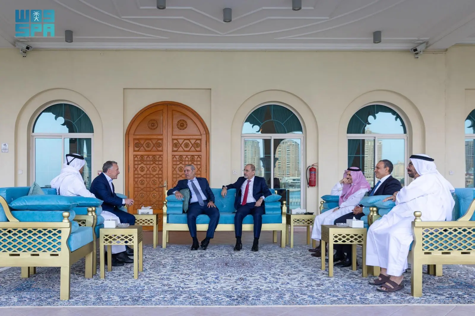 قام صاحب السمو الأمير فيصل بن فرحان بن عبدالله وزير الخارجية، اليوم ، بزيارة لدولة قطر، شارك خلالها في اجتماع ضم كلاً من معالي رئيس مجلس الوزراء وزير خارجية دولة قطر الشيخ محمد بن عبدالرحمن بن جاسم آل ثاني، ومعالي نائب رئيس الوزراء وزير الخارجية وشؤون المغتربين بالمملكة الأردنية الهاشمية الدكتور أيمن الصفدي، ومعالي وزير الخارجية والهجرة وشؤون المصريين بالخارج بجمهورية مصر العربية الدكتور بدر عبدالعاطي، ومعالي وزير الدولة بوزارة الخارجية في دولة الإمارات العربية المتحدة السيد خليفة شاهين المرر، وأمين سر اللجنة التنفيذية لمنظمة التحرير الفلسطينية السيد حسين الشيخ، ومبعوث الرئيس الأمريكي إلى الشرق الأوسط السيد ستيف ويتكوف.
