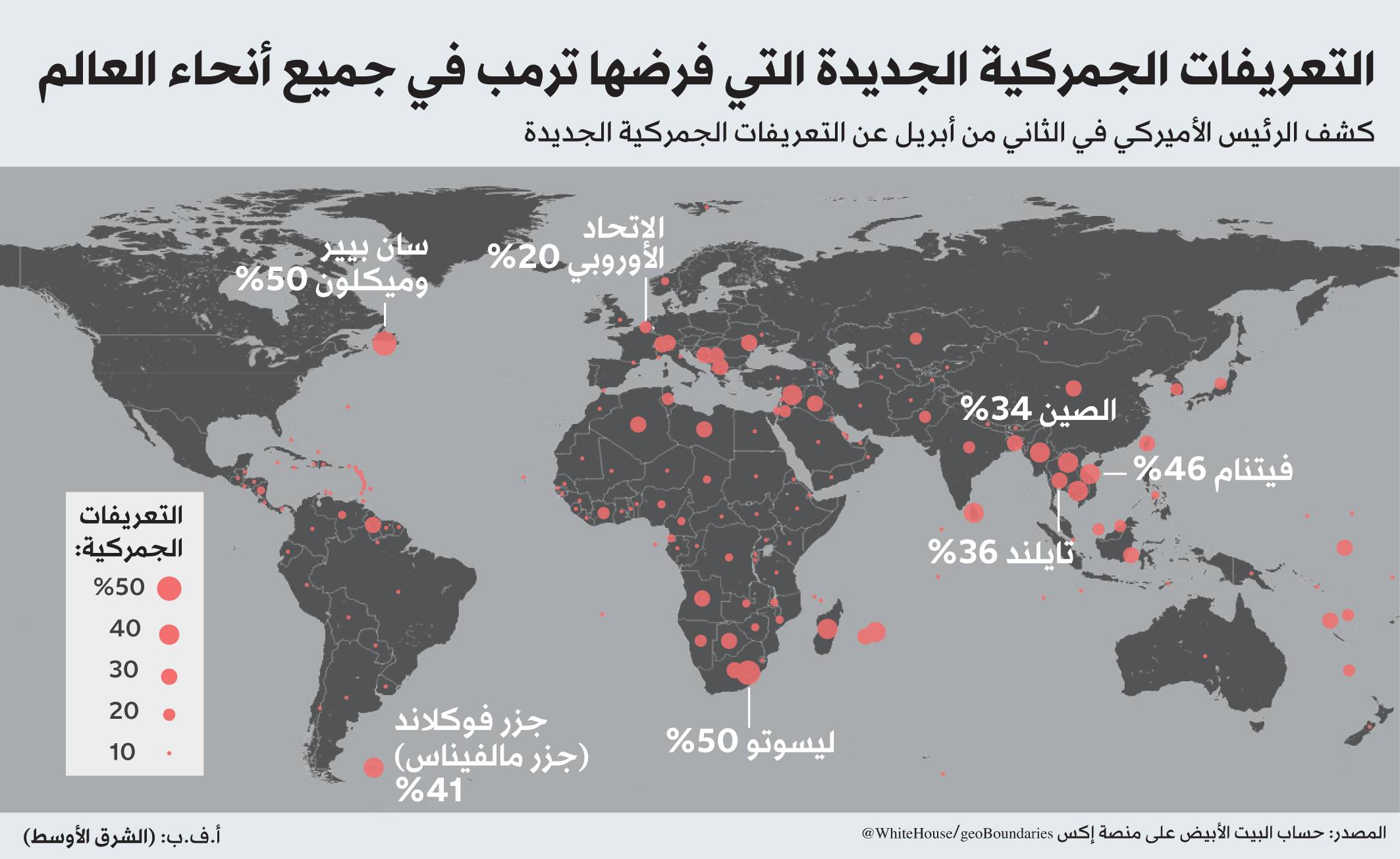 وفرض ترمب نوعين من الرسوم التي شملت مجتمعةً 180 دولة: الأول عبارة عن رسوم جمركية أساسية بنسبة 10 في المائة على الواردات الأميركية، والآخر رسوم جمركية متبادلة مع الدول التي لدى أميركا تبادل تجاري معها، حيث تراوحت بين 10 في المائة و49 في المائة.