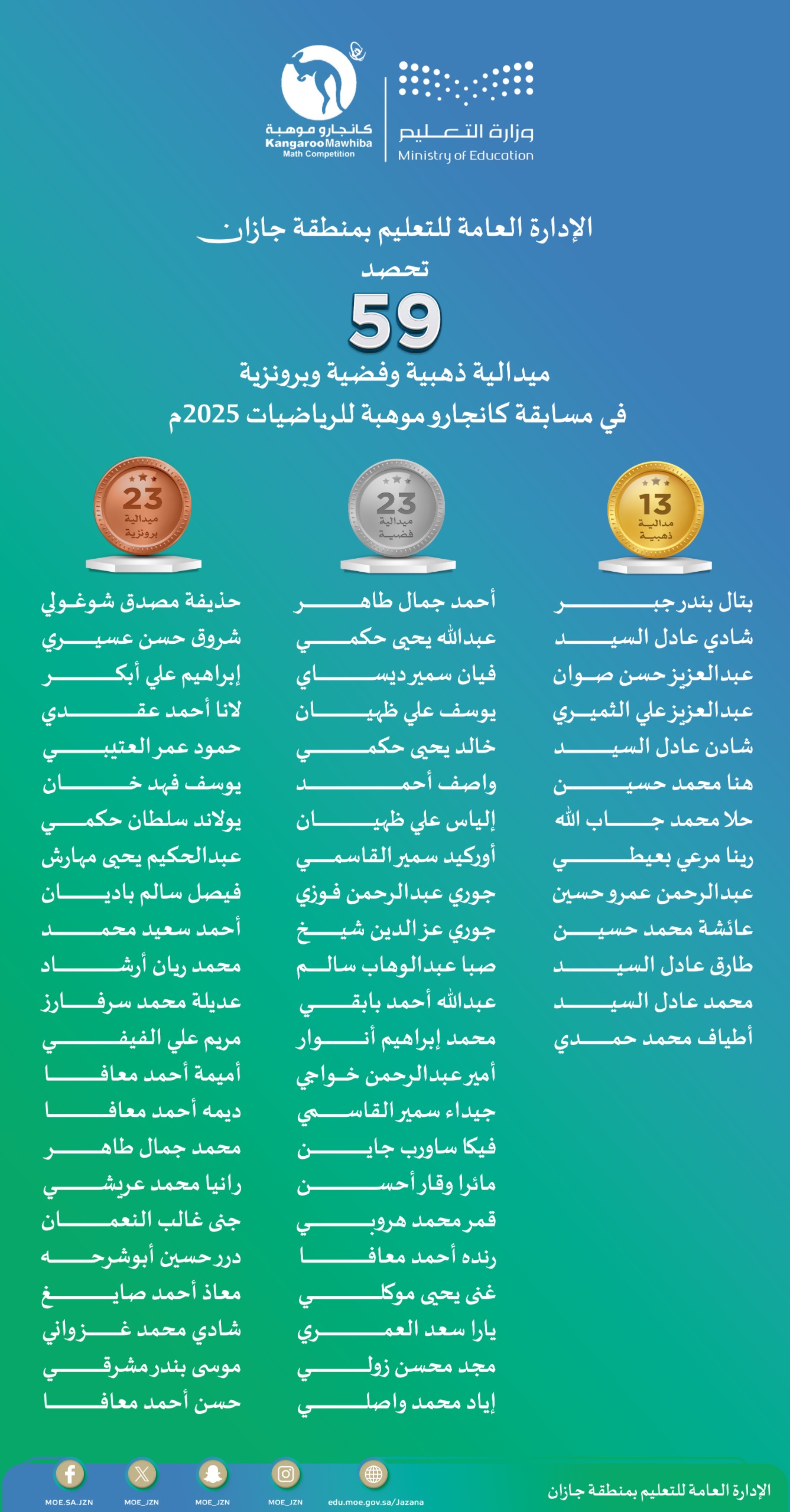 حصدت الإدارة العامة للتعليم بمنطقة جازان 59 ميدالية في مسابقة “كانجارو” موهبة للرياضيات 2025م، التي تنظمها مؤسسة الملك عبدالعزيز ورجاله للموهبة والإبداع (موهبة) بالتعاون مع وزارة التعليم، وحقق طلاب وطالبات تعليم جازان 13 ميدالية ذهبية، و23 فضية، و23 برونزية.