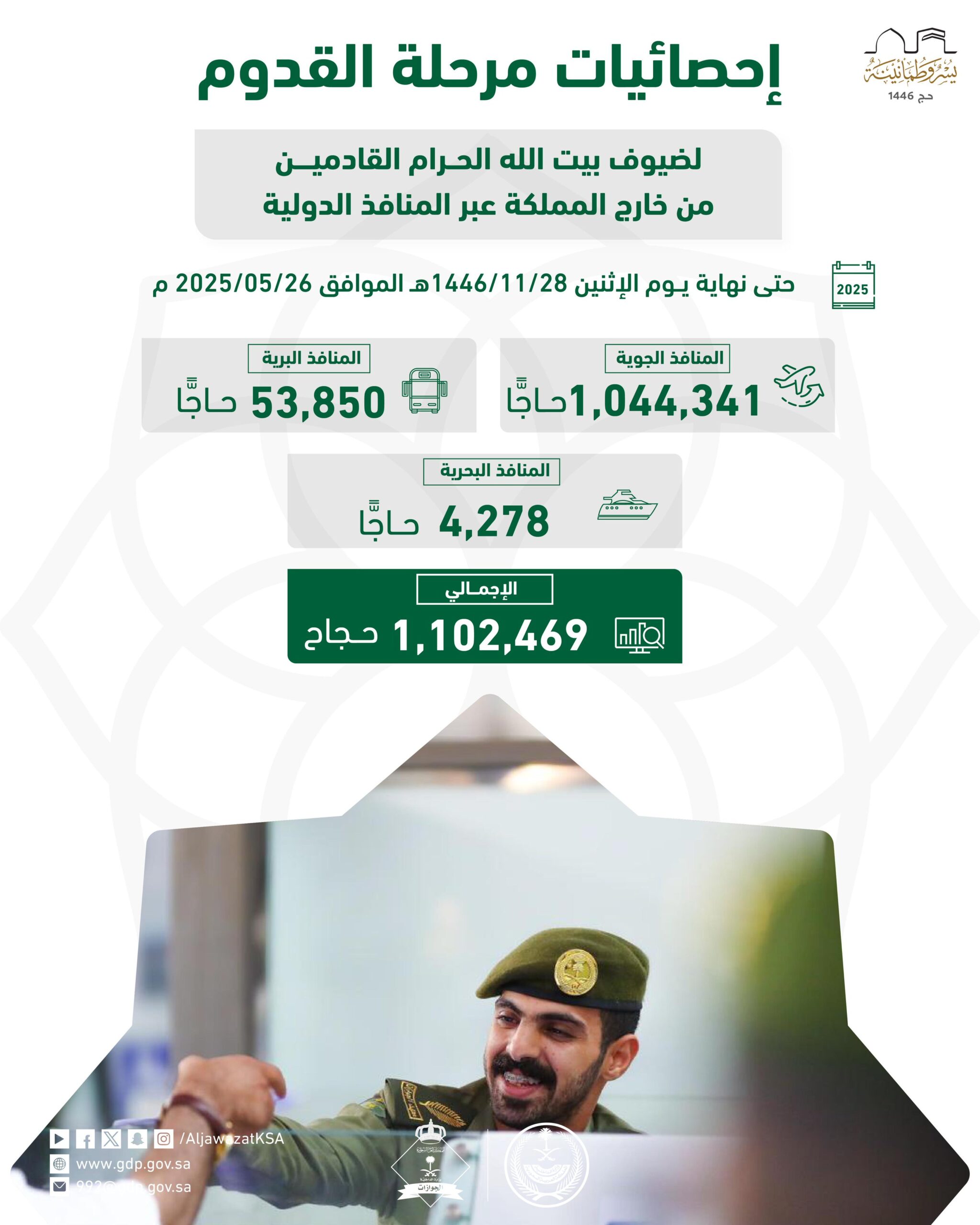 أعلنت المديرية العامة للجوازات، أن إجمالي ضيوف الرحمن القادمين من الخارج عبر جميع منافذ المملكة الجوية والبرية والبحرية، بلغ (1,102,469) حاجًّا، وذلك حتى نهاية يوم الاثنين 28/ 11/ 1446هـ.