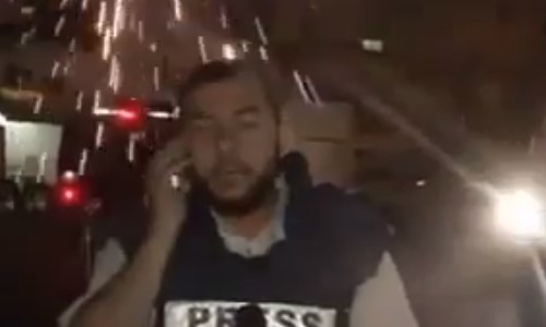 صيب على الهواء مباشرة مراسل قناة “فلسطين اليوم”  بشظايا إحدى القذائف الإسرائيلية التي أمطرت قطاع غزة ليلة البارحة؛ وذلك أثناء حديثه المباشر عن تعرّض كاميرته للتكسير.