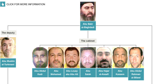الأول- أبو عبد الرحمن البيلاوي، اسمه عدنان إسماعيل نجم، ضابط سابق في الجيش، المسؤول العسكري الأول، قتل في الموصل في 5 يونيو الماضي.