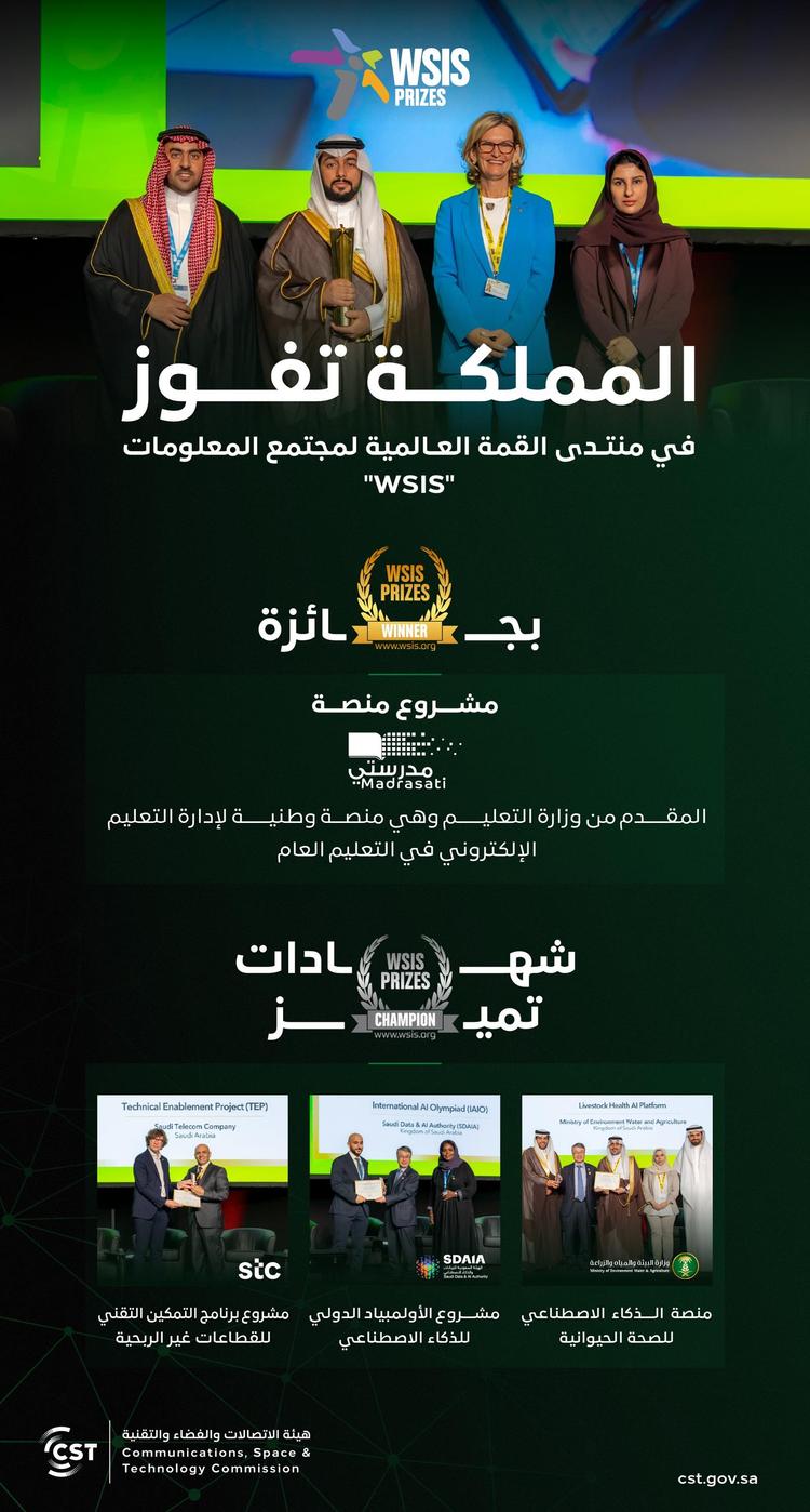 فازت المملكة بجائزة و3 شهادات تميز في منتدى القمة العالمية لمجتمع المعلومات “WSIS” التي ينظمها الاتحاد الدولي للاتصالات بالشراكة مع عدد من منظمات الأمم المتحدة، المنعقدة أعمالها بمدينة جنيف بسويسرا، وذلك نظير تميز مشاريعها الابتكارية بعد منافستها مشاريع من أكثر من (194) دولة.