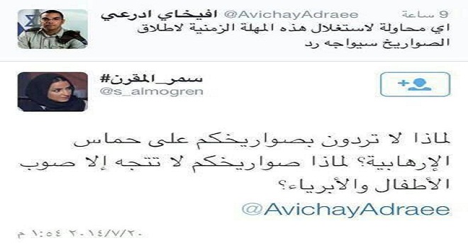 وكانت المقرن قد ردت على التغريدة التي كتبها المتحدث الإسرائيلي والتي كان نصها:” أي محاولة لاستغلال هذه المهلة الزمنية سيواجه رد”، وذلك في إشارة إلى الهدنة التي اتفق عليها الطرفان في غزة أمس الأحد (20 يوليو).