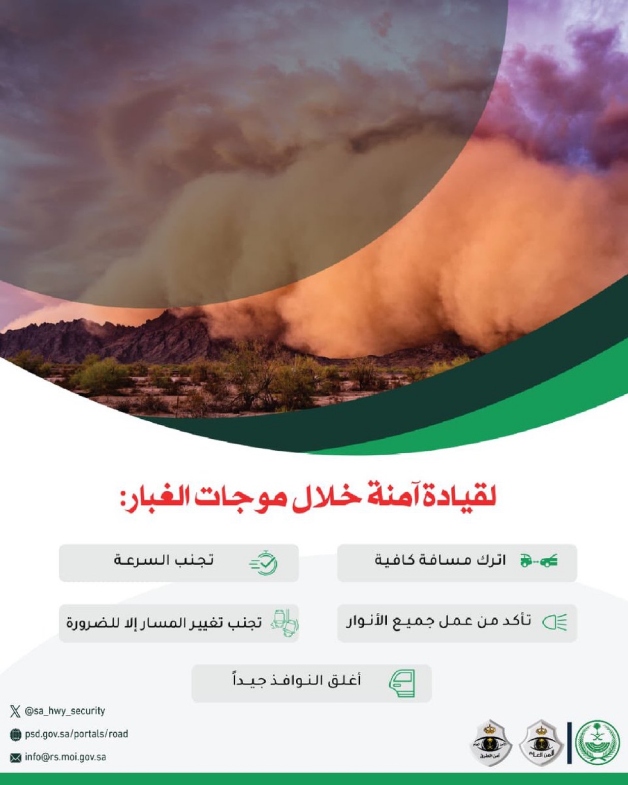 آخر الأخبار > أمن الطرق يحذر من القيادة في أجواء الغبار ويدعو للالتزام بإرشادات السلامة