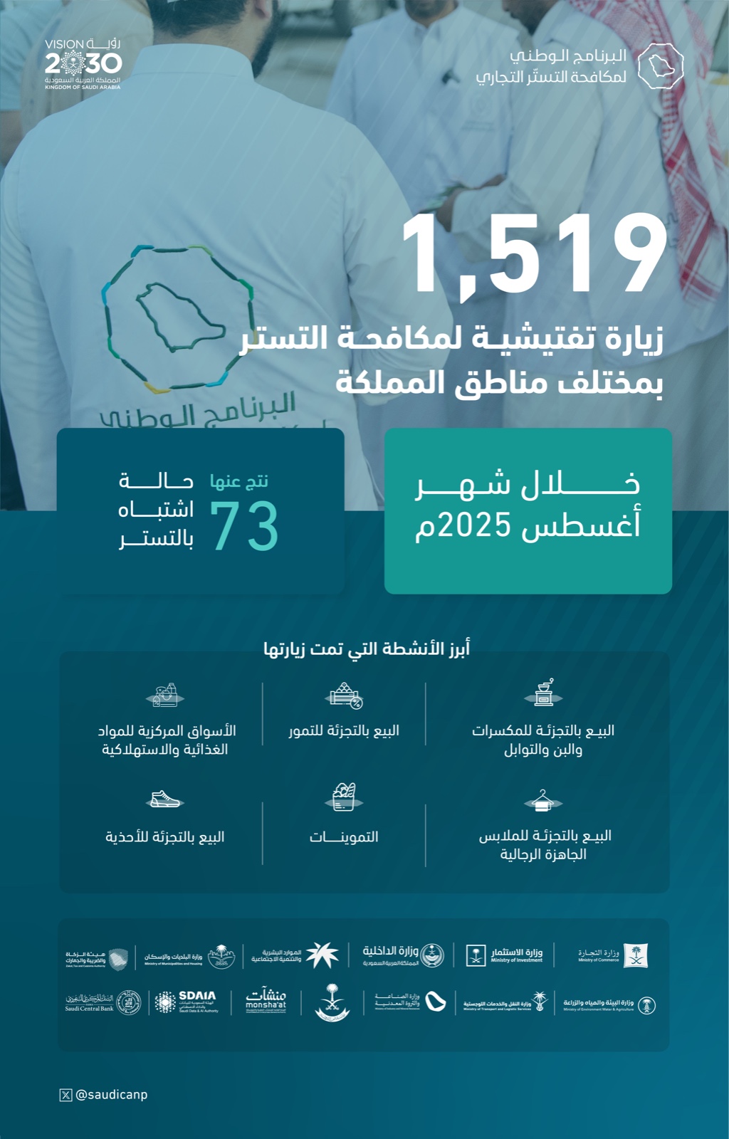 آخر الأخبار > البرنامج الوطني لمكافحة التستر التجاري يُنفذ أكثر من 1500 زيارة تفتيشية خلال أغسطس