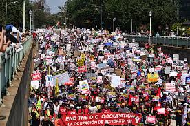 نظمت مظاهرة “كلنا دي سي”، التي قادها نشطاء الحكم الذاتي والاتحاد الأمريكي للحريات المدنية، مسيرة امتدت لأكثر من ميلين، بدءًا من حديقة ميريديان هيل إلى ساحة الحرية قرب البيت الأبيض، وحمل المتظاهرون لافتة حمراء كتب عليها “أنهوا احتلال دي سي” باللغتين الإنجليزية والإسبانية، معبرين عن غضبهم من استمرار القوات الفيدرالية في شوارع المدينة، ويُعد هذا الاحتجاج أقوى رد فعل حتى الآن على قرار ترامب الذي برره بمواجهة الجريمة والتشرد، رغم تأكيد مسؤولي المدينة انخفاض معدلات الجريمة العنيفة مقارنة بولايته الأولى، وفقًا لـ”أسوشيتد برس”.