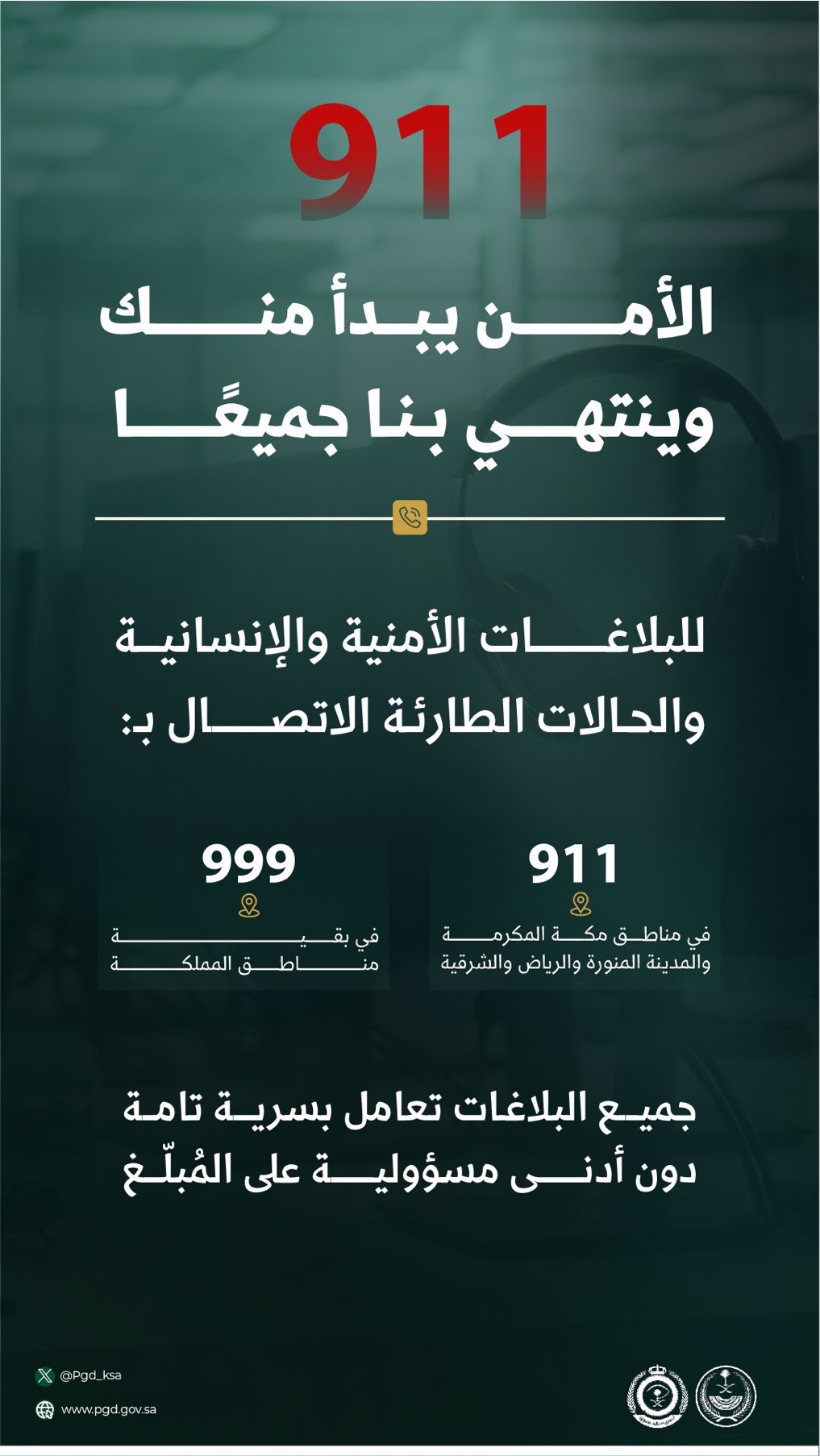 تستقبل البلاغات الأمنية والإنسانية عبر الرقم 911 في مناطق مكة المكرمة، والمدينة المنورة، والرياض، والمنطقة الشرقية، وعبر الرقم 999 في بقية مناطق المملكة، ويتعامل مع جميع البلاغات بسرية تامة ودون أي مسؤولية على المبلغ.