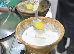 وعرضت البائعة فاطمة حسن “أُم عبدة” طريقة استخراج منتجات حليب الأبقار وتحويله إلى لبن طازج وسمن طبيعي غني بالفوائد، موضحة أن العملية تبدأ بحلب الأبقار، ثم يُترك الحليب أكثر من عشر ساعات، ويُوضع بعد إضافة قليل من الماء في “الدبية”، وهي أداة تقليدية مصنوعة من ثمرة شجرة القرع، وتُغلق بإحكام، ثم تُرج وتقلب باستمرار حتى تنفصل الزبدة عن اللبن.