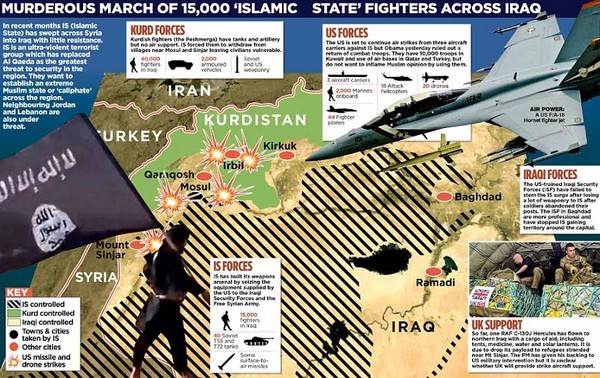 وحسب تقرير لصحيفة “الديلي ميل” البريطانية، تتكون القوات الأمريكية المعدة لضرب تنظيم “داعش” الإرهابي من: ثلاث حاملات طائرات، و44 طائرة مقاتلة، و20 طائرة من دون طيار،  18 مروحية مقاتلة، بالإضافة إلى ألفين من جنود مشاة البحرية الأمريكية “المارينز”.
