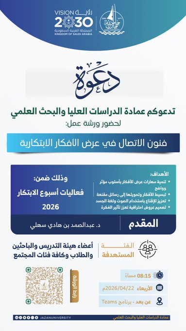 نظّمت جامعة جازان -ممثّلةً في عمادة الدراسات العليا والبحث العلمي- اليوم، ورشة عمل بعنوان “فنون الاتصال في عرض الأفكار الابتكارية”، وذلك عبر تطبيق “تيمز”، ضمن فعاليات أسبوع الابتكار 2026.