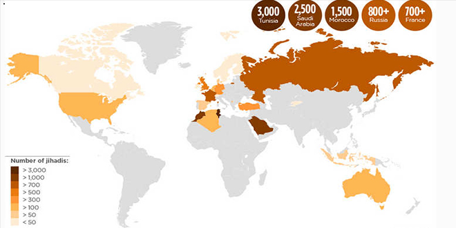 وتوضح أرقام الخريطة المأخوذة من الإحصاءات الرسمية للدول، بحسب المركز، أن أكثر الدول التي خرج منها مقاتلون إلى سوريا هي تونس؛ حيث وصل عددهم إلى ثلاثة آلاف، ثم المملكة العربية السعودية التي خرج منها 2500 شخص، تلتها المغرب بـ1500 شخص.