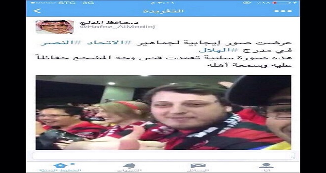 توصَّل متابعون بمواقع التواصل الاجتماعي إلى المشجع النصراوي “القضية” الذي كتب عنه د. حافظ المدلج، رئيس لجنة التسويق بالاتحاد الآسيوي تغريدة عنه أمس على حسابه الرسمي بموقع تويتر باعتباره نموذجا سلبيا للتشجيع، وذلك بعدما ظهر مبتسما في مدرجات فريق سيدني وهو يساند فريقهم ضد الهلال.