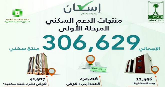 أعلنت وزارة الإسكان قائمة منتجاتها السكنية في جميع مناطق المملكة والتي ستبدأ بتخصيصها للمواطنين في دورتها الأولى، حيث بلغت 306,629 منتجًا سكنيًاً.. توزعت ما بين أرض وقرض بعدد (252,216 )، ومنتج وحدة سكنية بعدد (12,496)، ومنتج قرض سكني لشراء شقة سكنية بالشراكة مع المطورين العقاريين على أراضي الوزارة بعدد (41,917 ) شقة سكنية.