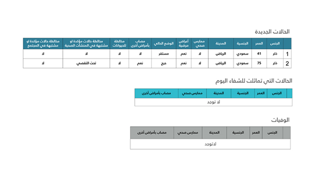 أكدت وزارةُ الصحة إصابة مواطِنَيْن بفيروس كورونا المسبب لمتلازمة الشرق الأوسط التنفسية، فيما لم يتم تسجيل أي حالة شفاء أو وفاة.