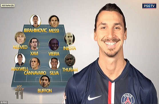 وضع النجم السويدي زلاتان إبراهيموفيتش مهاجم باريس سان جيرمان الفرنسي نفسه في خط الهجوم إلى جانب النجم الأرجنتيني ليونيل ميسي مهاجم برشلونة الإسباني في تشكيلة فريق الأحلام، في الوقت الذي تجاهل فيه النجم البرتغالي كريستيانو رونالدو مهاجم ريال مدريد.