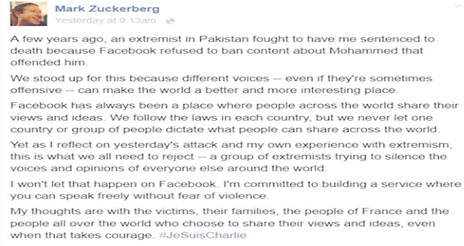 وفيما يخص الهجوم الإرهابي الذي تعرضت له صحيفة “شارلي إيبدو” الفرنسية قال “زوكربيرج”: أفكاري مع الضحايا والأهالي والشعب الفرنسي وكل الناس حول العالم الذين اختاروا أن يشاركوا آراءهم وأفكارهم بكل شجاعة”.