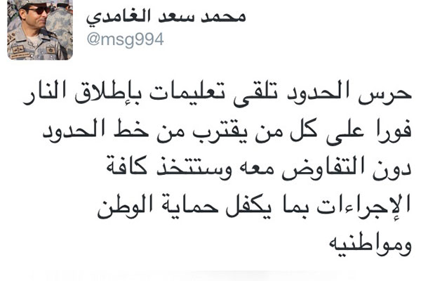 وأطلق “الغامدي” -عبر حسابه الشخصي في موقع التواصل الاجتماعي “تويتر”، الأحد (18 يناير 2015)- تغريدة قال فيها: “حرس الحدود تلقى تعليمات بإطلاق النار فورًا على كل من يقترب من خط الحدود دون التفاوض معه، وستتخذ كل الإجراءات، بما يكفل حماية الوطن ومواطنيه”.