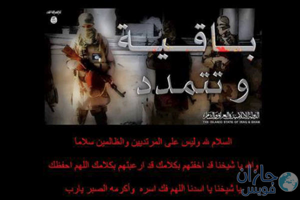 الرسالة “الداعشية” جاءت بحروف مكتوبة باللون الأحمر على خلفية سوداء، وفي نصها: “السلام لله، وليس على المرتدين والظالمين سلامًا، والله يا شيخنا قد أخفتهم بكلامك.. قد أرعبتهم بكلامك.. اللهم احفظك يا شيخنا يا أسدنا.. اللهم فكّ أسره وأكرمه بالصبر يا رب”.