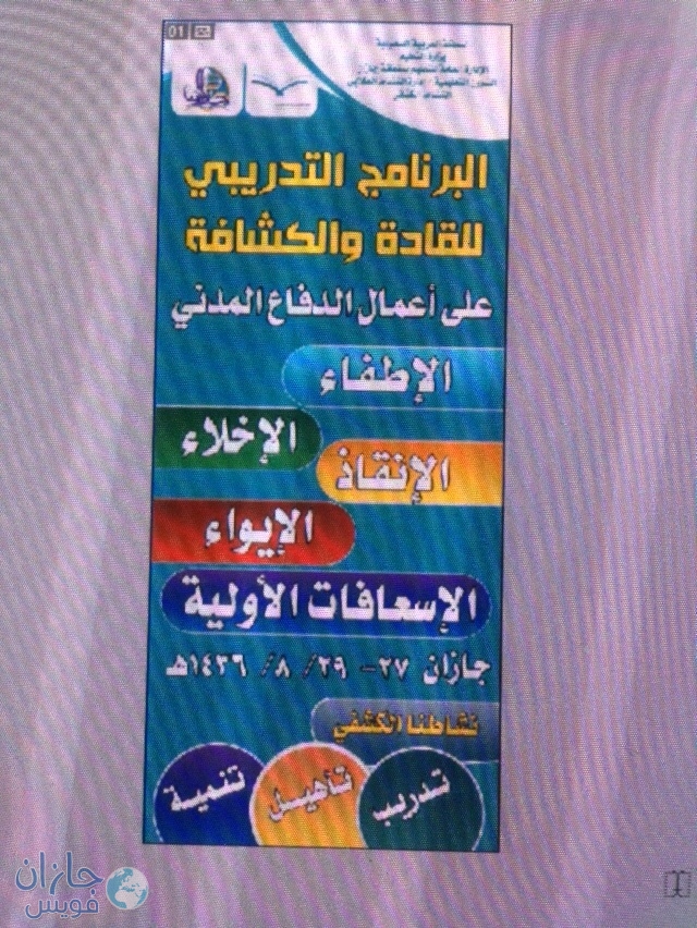 ينطلق البرنامج الكشفي للتدريب على اعمال الدفاع المدني والاسعافات الاولية والذي تشارك فيه خمس جهات حكومية وهي إدارة الدفاع المدني بمنطقة جازان إدارة التدريب والابتعاث بصحة جازان إدارة النشاط الطلابي – الكشفي إدارة الأمن والسلامة إدارة الصحة المدرسية ومساندة مكاتب التربية والتعليم – وحدات النشاط الطلابي المفوضيات الكشفية – ادارة الإعلام التربوي – ادارة خدمات الطلاب ويضم العديد من البرامج والتي تبدا من 27_ 29 / 8 ومنها برنامج إدارة الأزمات ودورة أعمال الدفاع المدني ودورة الاسعافات الاولية دور الحركة الكشفية في الأزمات والكوارث مسرح الإدارة العامة للتعليم بمنطقة جازان وأوضح رئيس قسم النشاط الكشفي في تعليم جازان محمد موسى ملحان أن البرنامج يحضى بمتابعة واهتمام من مدير عام التعليم في جازان عيسى حكمي ومدير إدارة النشاط الطلابي نايف عطيف ويعد من البرامج النوعية التي تساعد على تدريب العديد من القادة والكشافين على إدارة الأزمات والكوارث وهو ضمن سلسلة برامج متلاحقة تنفذ على مراحل خلال الفترة المقبلة. … الخبر للنشر