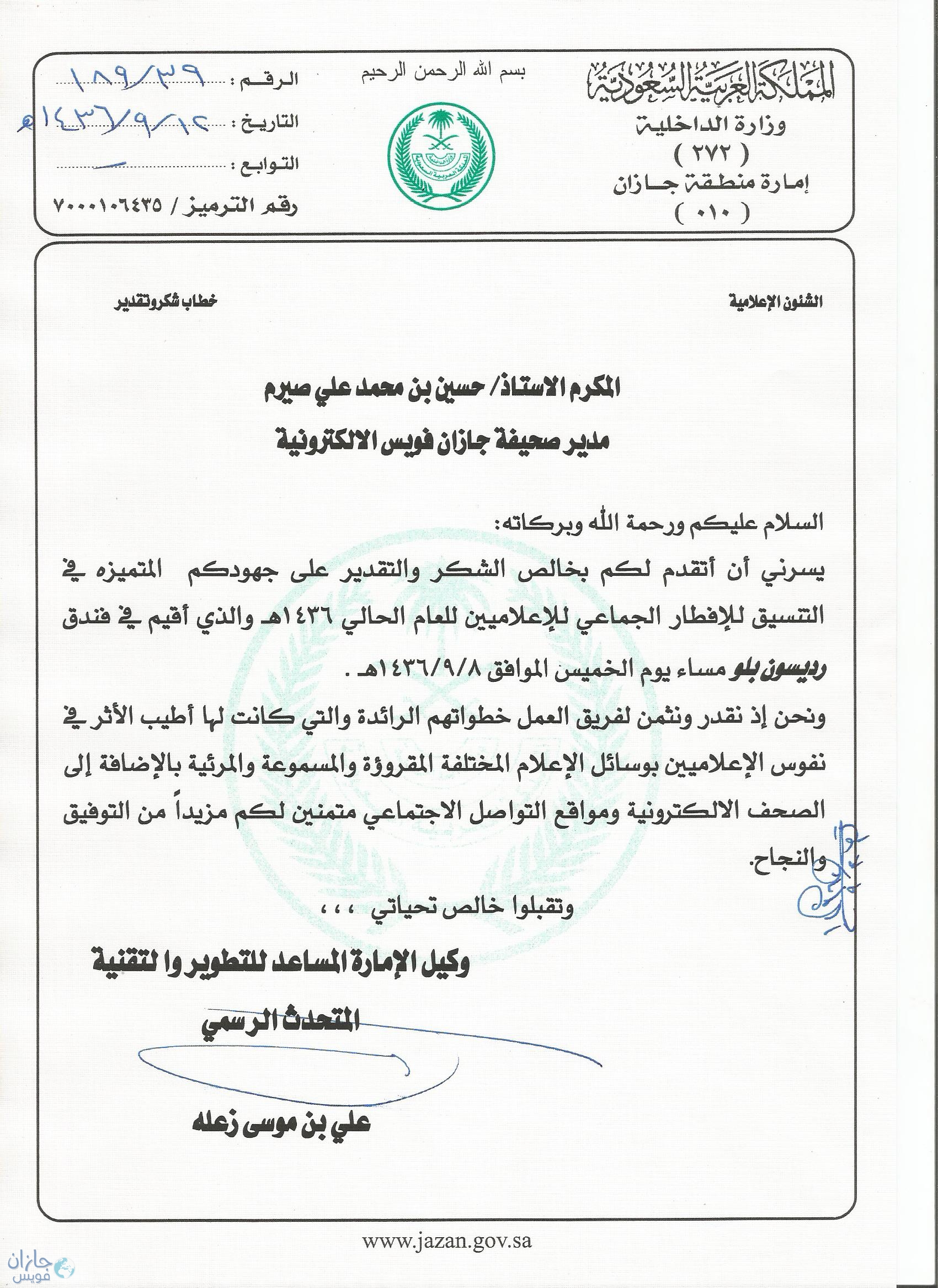 وجه وكيل الإمارة المساعد للتطوير والتقنية والمتحدث الرسمي باسم أمارة منطقة جازان الاستاذ/علي بن موسى زعلة بخطاب شكر لمدير صحيفة جازان فويس الالكترونية الإعلامي/حسين بن محمد علي صيرم وذلك لجهوده المبذولة في خدمة الإعلام والإعلاميين بالمنطقة  وقيامه بإعداد وتنسيق الإفطار الجماعي للإعلاميين خلال العام 1436هـ والذي أقيم  بفندق (الرديسون بلو بجازان) مساء يوم الخميس الموافق 08/09/1436هـ برعاية من شركة الطريق الدولي للتجارة والصيانة مقدرا ومثمن لفريق العمل خطواتهم الرائدة والتي كانت لها أطيب الأثر في نفوس الإعلاميين والإعلام بجميع  وسائله المختلفة المقروءة  والمسموعة والمرئية بالإضافة إلى الصحف الالكترونية و مواقع التواصل الاجتماعي متمنين له ولفريق العمل مزيدا من التقدم والنجاح.