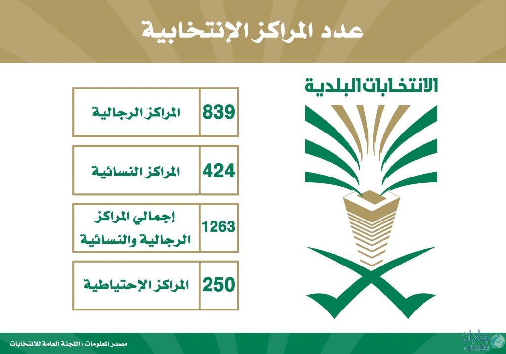 اعتمدت اللجنة العامة للانتخابات البلدية (1263) مركزاً انتخابياً موزعة على (284) أمانة وبلدية على مستوى المملكة وذلك خلال الدورة الثالثة من الانتخابات التي تبدأ أولى مراحلها في السابع من ذي القعدة المقبل بقيد الناخبين ، كما اعتمدت اللجنة العامة (250) مركزاً انتخابياً احتياطيا موزعة على اللجان المحلية بكافة مناطق المملكة بحيث يتم فتحها مباشرة عند الحاجة إليها أو عند وصول أحد المراكز الانتخابية إلى طاقتها الاستيعابية القصوى المحددة بثلاثة آلاف ناخب.