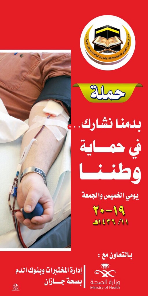 يقيم المكتب التعاوني للدعوة والإرشاد وتوعية الجاليات بالعالية وضمن برنامج شباب فلة وبالتعاون مع إدارة المختبرات وبنوك الدم بصحة جازان ومستشفى الأمير محمد بن ناصرحملة التبرع بالدم لجنودنا المرابطين على الحد الجنوبي .
