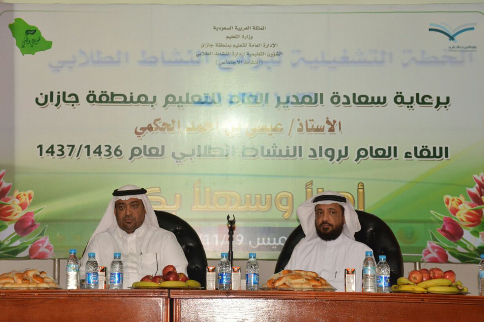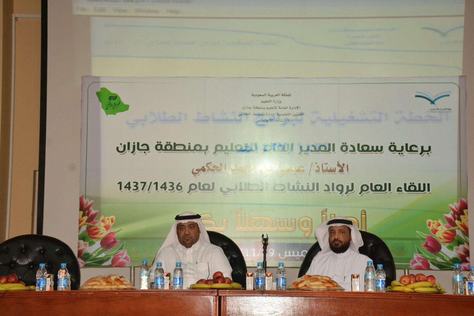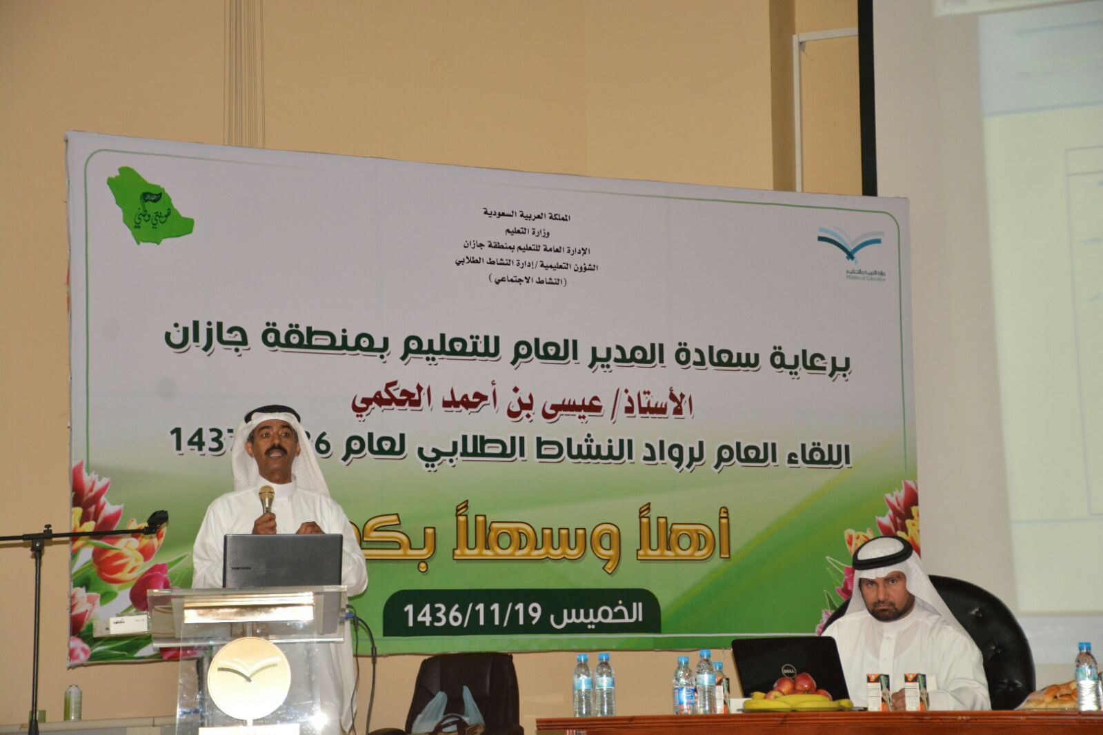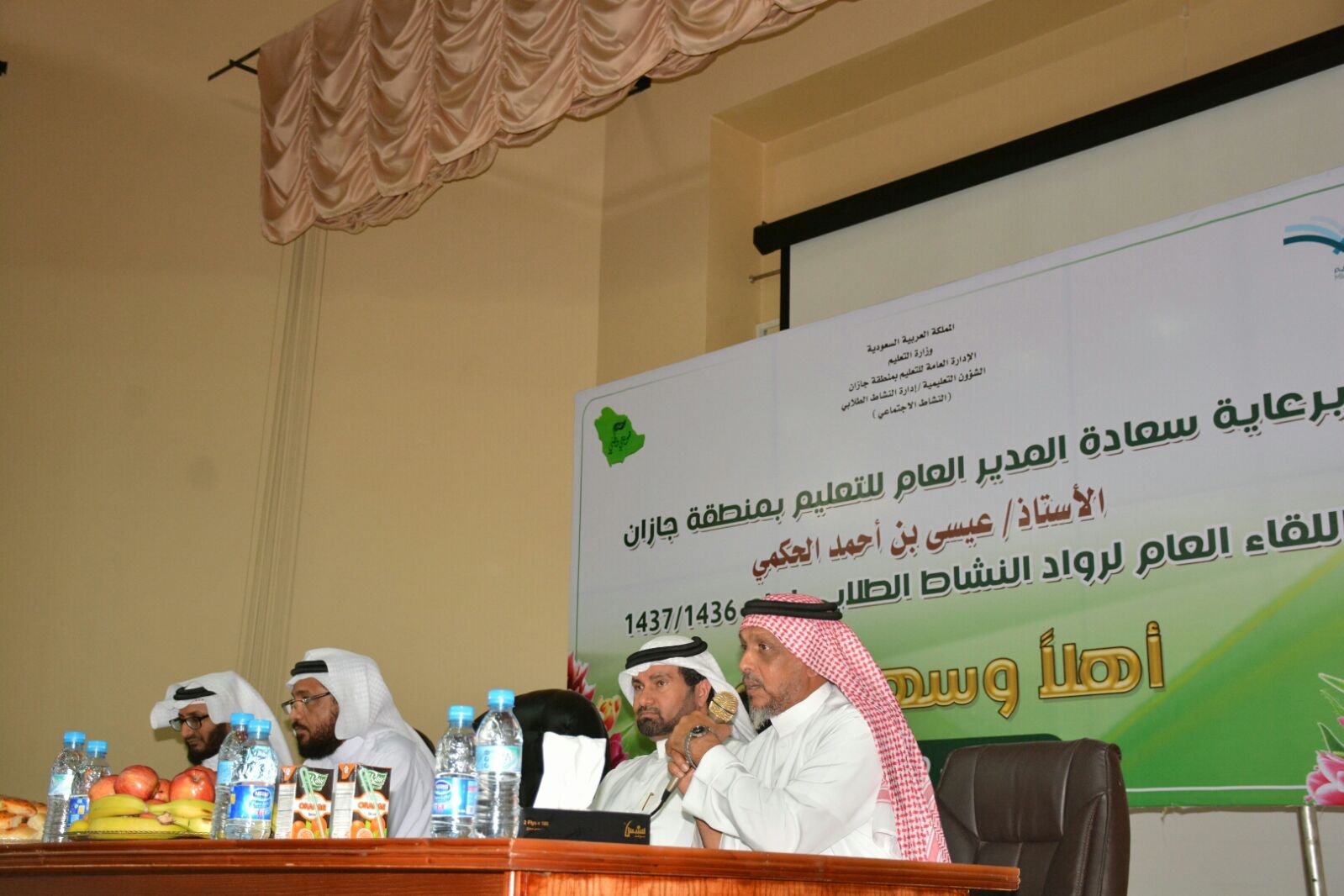 نيابة عن سعادة المدير العام للتعليم بمنطقة جازان الأستاذ/عيسى بن أحمد الحكمي، رعى المساعد للشؤون التعليمية الأستاذ /ياسر بن فتح الدين دويري، اللقاء العام لرواد النشاط الطلابي الذي عقدته إدارة النشاط الطلابي صباح اليوم الخميس 19 – 11- 1436هـ، بحضور مدير إدارة النشاط الطلابي الأستاذ / نايف بن محمد عطيف ومساعد مدير إدارة النشاط الطلابي الأستاذ علي خميسي ورئيس قسم النشاط الاجتماعي الأستاذ محمد بن إبراهيم النعمي، وعدد من رؤساء الأقسام.