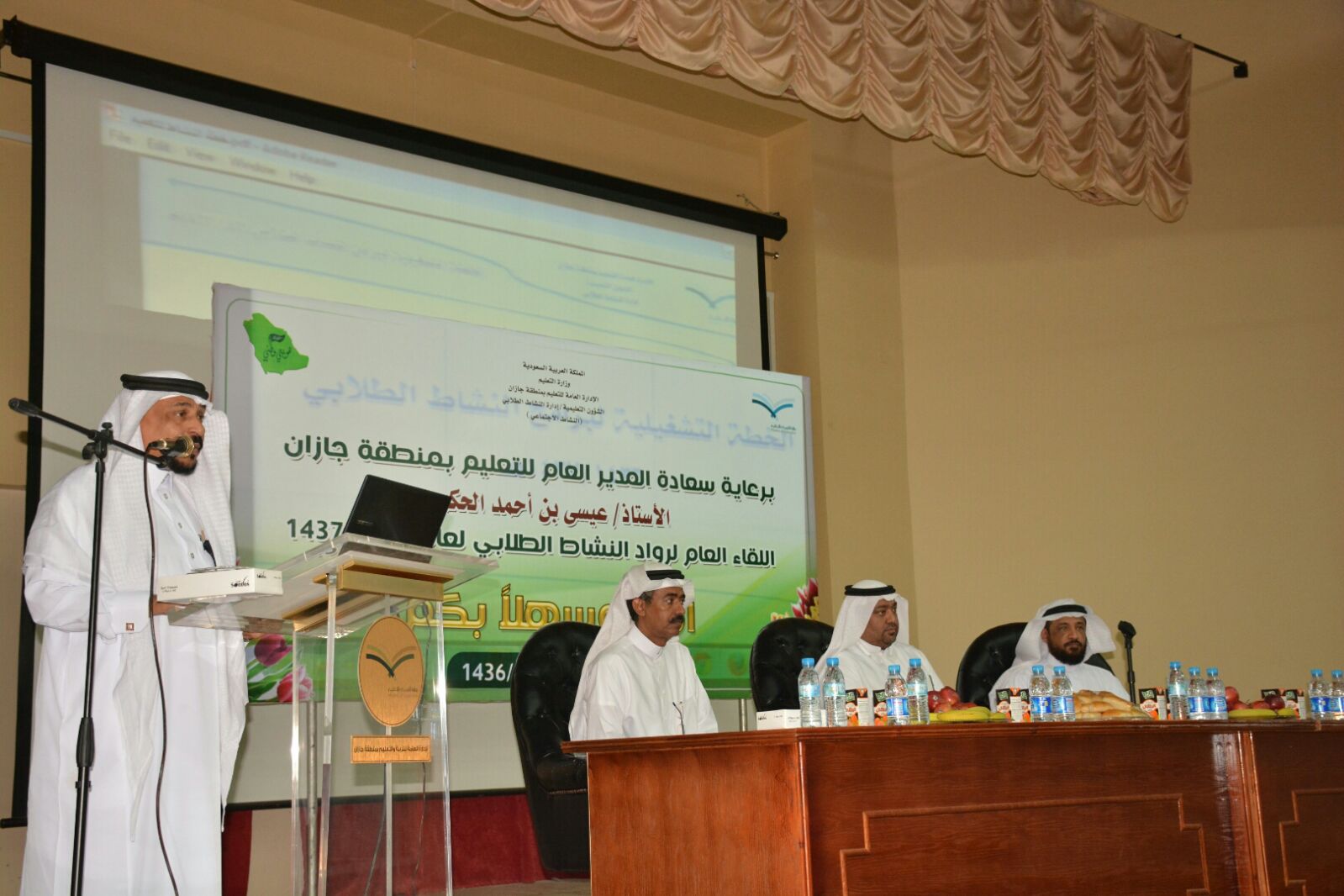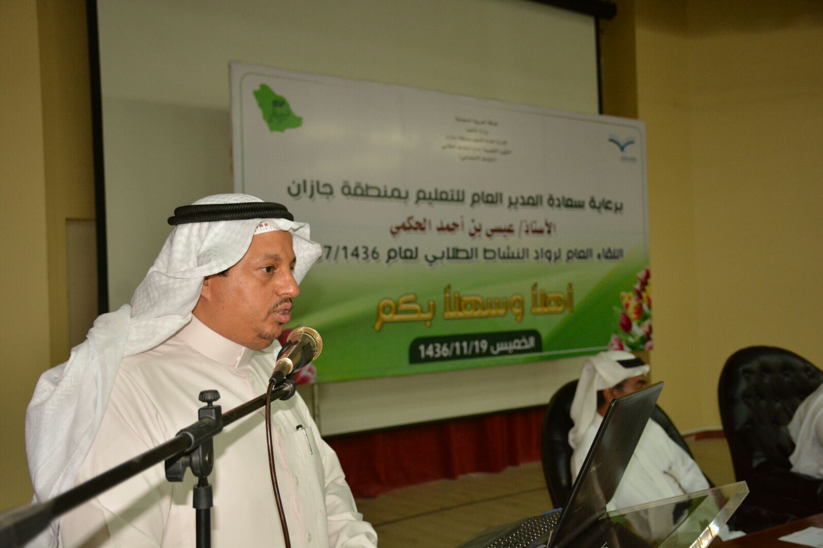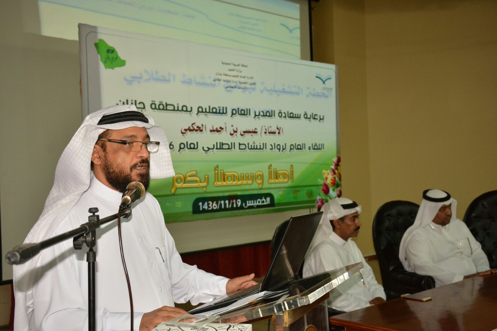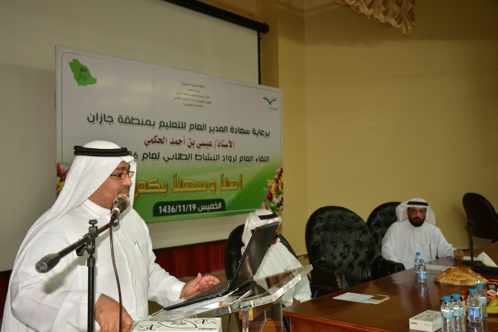 نيابة عن سعادة المدير العام للتعليم بمنطقة جازان الأستاذ/عيسى بن أحمد الحكمي، رعى المساعد للشؤون التعليمية الأستاذ /ياسر بن فتح الدين دويري، اللقاء العام لرواد النشاط الطلابي الذي عقدته إدارة النشاط الطلابي صباح اليوم الخميس 19 – 11- 1436هـ، بحضور مدير إدارة النشاط الطلابي الأستاذ / نايف بن محمد عطيف ومساعد مدير إدارة النشاط الطلابي الأستاذ علي خميسي ورئيس قسم النشاط الاجتماعي الأستاذ محمد بن إبراهيم النعمي، وعدد من رؤساء الأقسام.