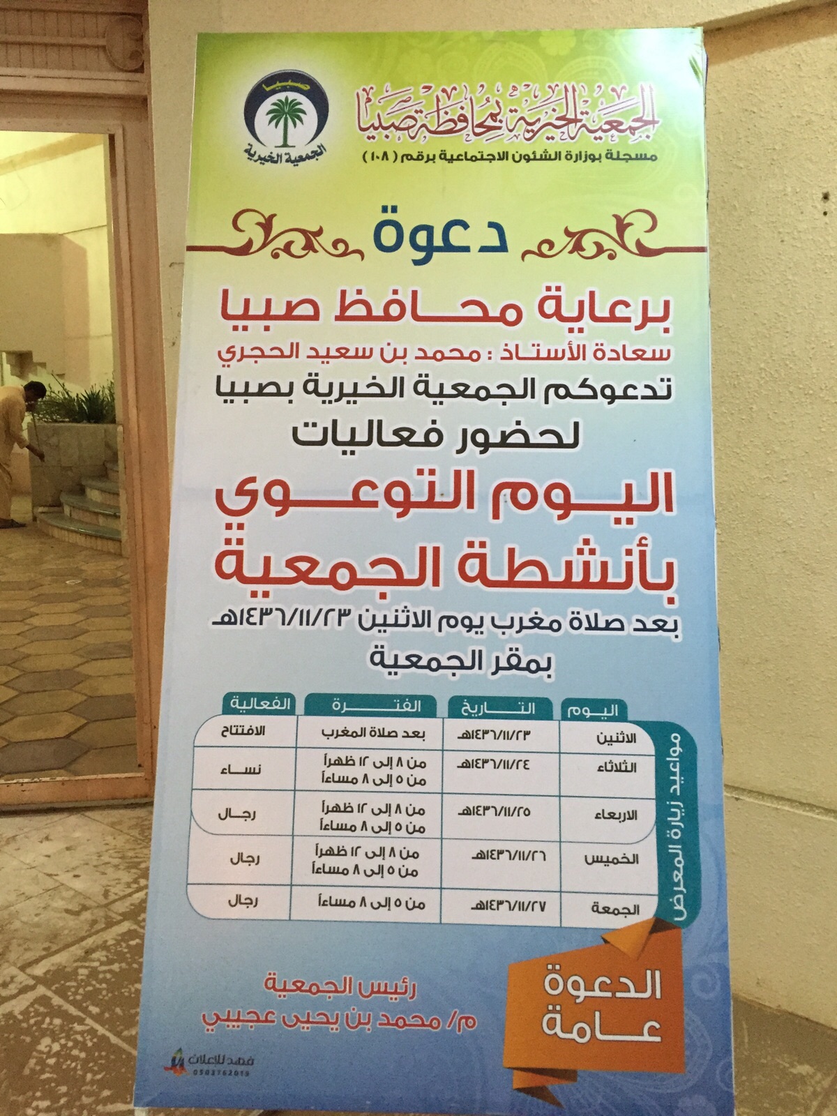 بحضور سعادة محافظ صبيا الأستاذ / محمد بن سعيد الحجري تم مساء أمس الاثنين تدشن انطلاقة اليوم التوعوي بأنشطة الجمعية والمعرض المصاحب بحضور سعادة رئيس الجمعية المهندس محمد بن يحيي عجيبي وعدد من الحضور وقد بدء الحفل بتلاوة ايات من القرآن الكريم ثم كلمة الجمعية رئيس الجمعية المهندس محمد عجيبي قدم فيها شكره لسعادة محافظ صبيا على رعايته لليوم التوعوي ومرحبا بالحضور موضحا في كلمته أن الجمعية تفتح أبوابها للزوار للإطلاع على أنشطة الجمعية ثم قدم طالبين تقريرا عن برامج وأنشطة الجمعية ثم تجول سعادة محافظ صبيا والزوار في المعرض التوعوي الذي يحتوي جميع اقسام الجمعية ثم اختتم الحفل بتوزيع هدايا التكريم على الجهات الداعمة والمتعاونه مع الجمعية والجهات الإعلامية التى ساهمت في تسليط الضوء على أنشطة الجمعية ثم قدم سعادة رئيس الجمعية الخيرية بصبيا درع تذكاري بهذه المناسبة لسعادة محافظ صبيا