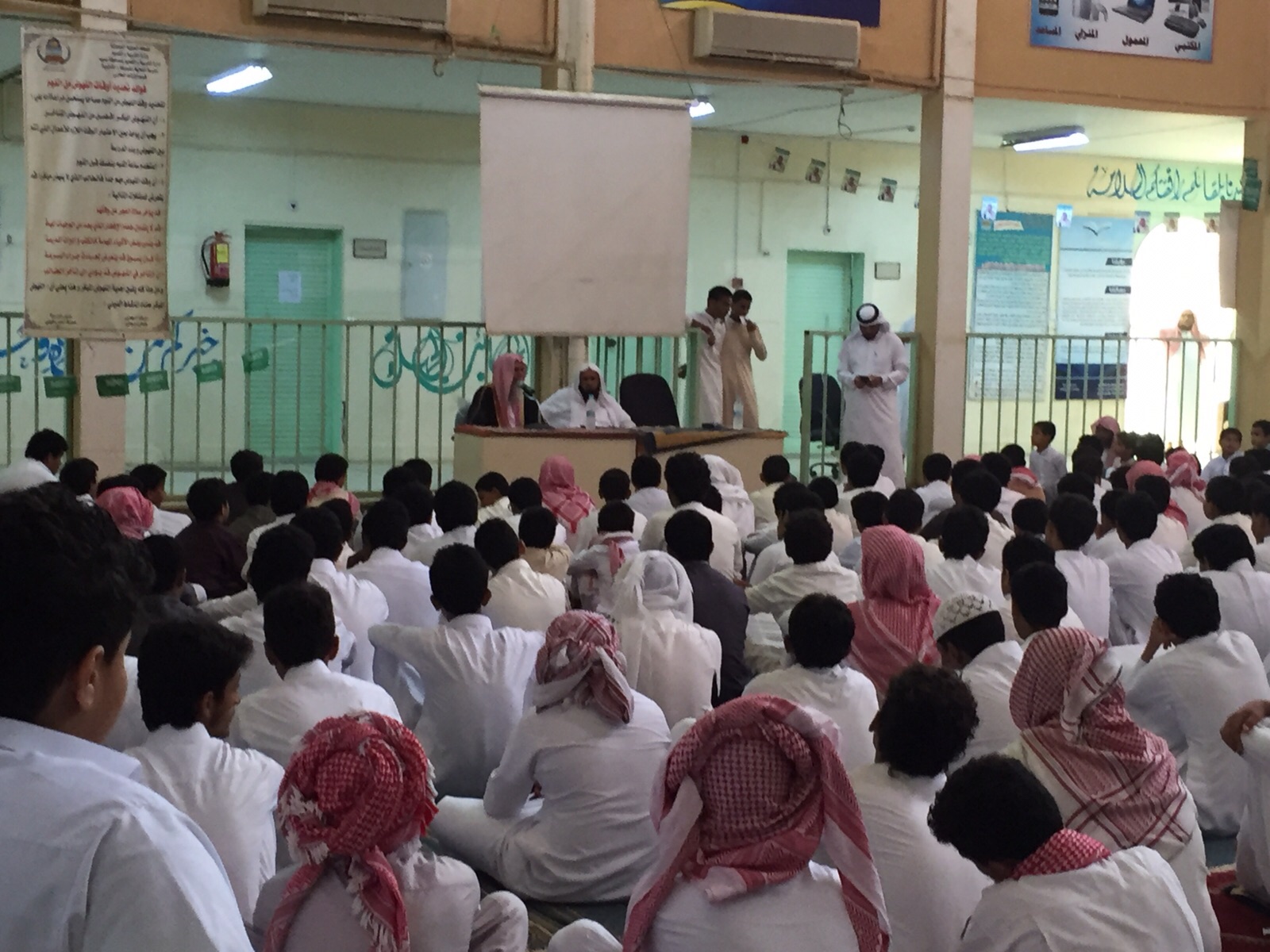 ودعا الطلاب الى التمسك بالدِّين الاسلامي وبسنة نبينا محمد صلى الله عليه وسلم ومجالسة الصالحين ومحذرا الطلاب من أهل المخدرات حتى لاتذهب عقولهم والعودة الى الله ودعا الله ان يحفظ بلادنا وان يحفظ حكومتنا. وان يحفظ خادم الحرمين الشريفين الملك سلمان بن عبد العزيز. وولي العهد وولي ولي العهد. وجنودنا الابطال. المدافعين عن ديننا وعن عقيدتنا عن بلادنا الغالية.”‘