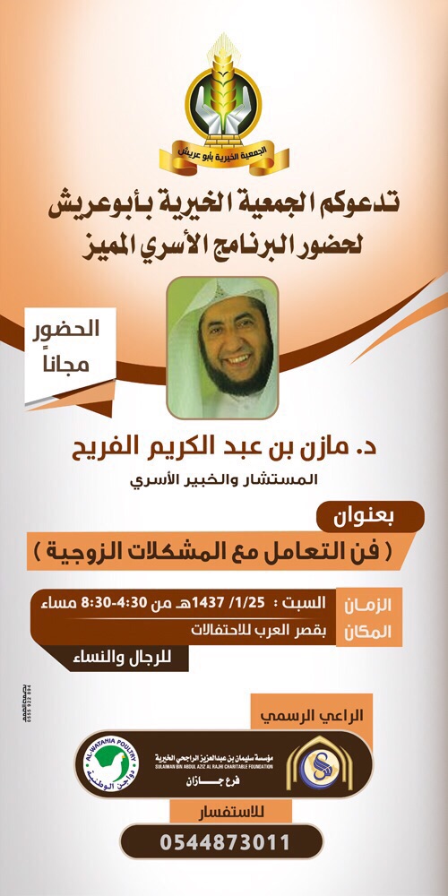 تعقد الجمعية الخيرية بمحافظة ابوعريش دورة بعنوان (فن التعامل مع المشكلات الزوجية ) يقدمها المدرب المتميز أ.مازن بن عبد الكريم الفريح ..الخبير والمستشار الاسري , وذلك يوم السبت السبت ٢٥ محرم 1437هـ من 4.30م الى 8.30 م