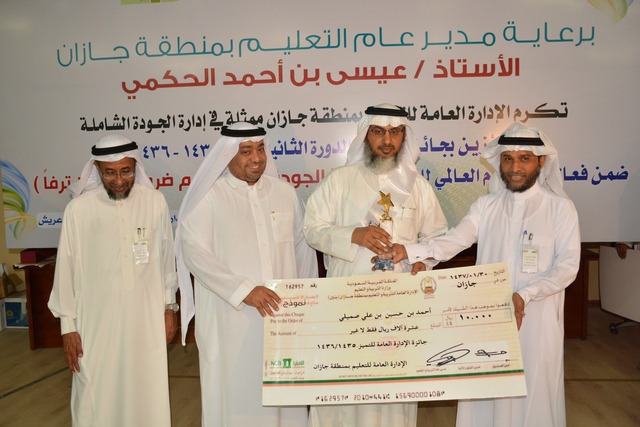 وفي الختام كرم المدير العام للتعليم بمنطقة جازان عيسى بن أحمد الحكمي الفائزين بمسابقة العام الماضي في الجودة بدروع تذكارية ومبلغ 10 ألف ريال لكل فائز بالمسابقة.