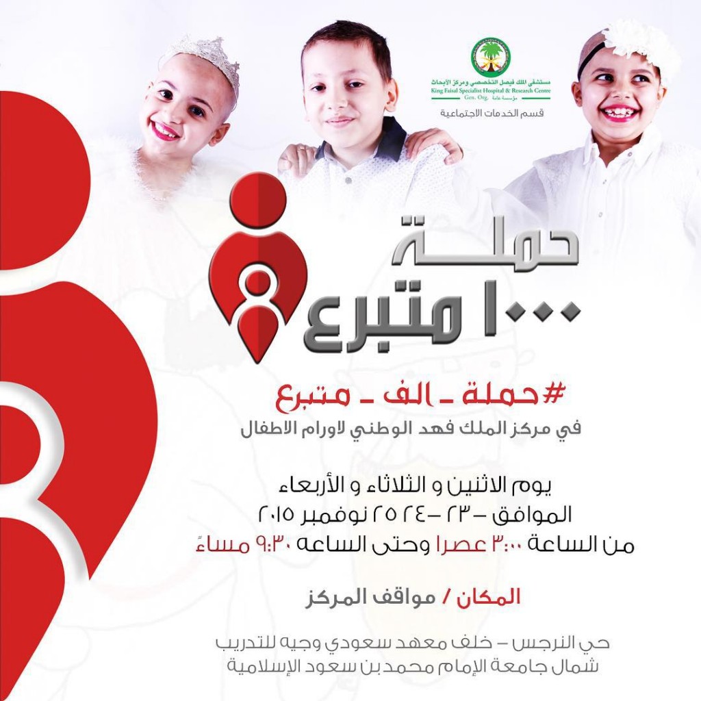 ينطلق يوم اﻷثنين القادم ولمده ثلاث أيام فى مركز الملك فهد ﻷورام اﻷطفال شمال الرياض ،حملة الالف متبرع الثانيه للتبرع بالدم لﻷطفال المصابون بالسرطان , وسوف يكون التبرع بالدم لصالح اﻷطفال المرضى بالسرطان شفاهم الله .
