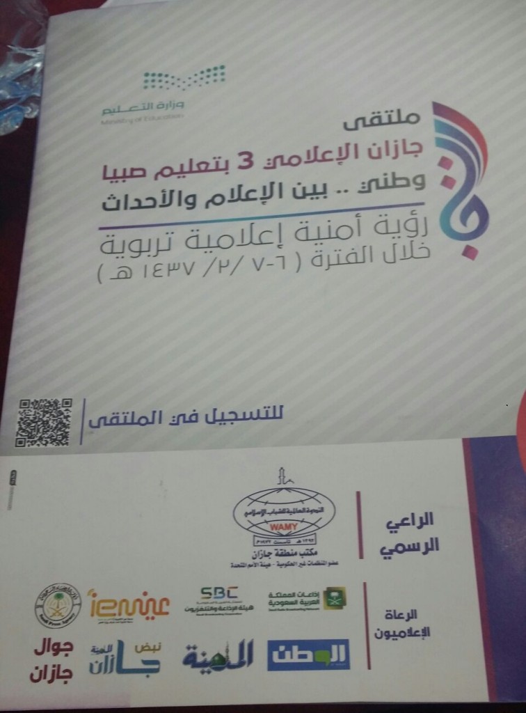 شاركت نخبة من خريجات قسم الصحافة والإعلام بجامعة جازان , بفعاليات ملتقي جازان الاعلامي -3 بتعليم صبيا تحت شعار وطني بين الاعلام والأحداث ( رؤية امنية اعلامية تربوية )خلال الفترة 6-7 /2 1437هـ بصالة الأنشطة للاجتماعات بتعليم صبيا. وجاءت المشاركه في سبيل تدعيم علاقه الكليه بالمجمتع وكجانب تدريبي لخريجات القسم على حضور الملتقيات الاعلاميه والتغطيه الصحفيه لتلك الملتقيات .